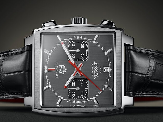 39mm stainless steel case with crown and chronograph pushers on the right. The grey dial is the biggest feature of these watches replica, as the usual replica TAG Heuer Monaco watches use a blue dial. The grey dial with a vertical brushed finish is a more understated option. Two black chronograph dials with silver hands are located at 3 and 9 o’clock. The red tones on the 12 o’clock hour markers and hands contrast sharply with the dark grey dial. The date window is still above the 3 o’clock position.